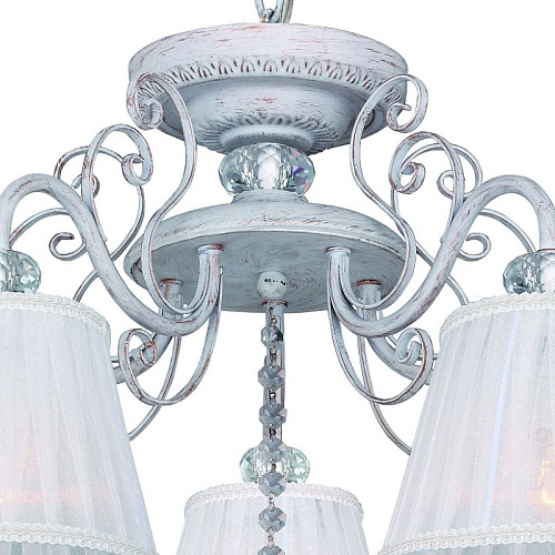 Металлический каркас состаренного белого цвета с золотом, абажуры из белой органзы, декор из прозрачного хрусталя, регулируемая высота.