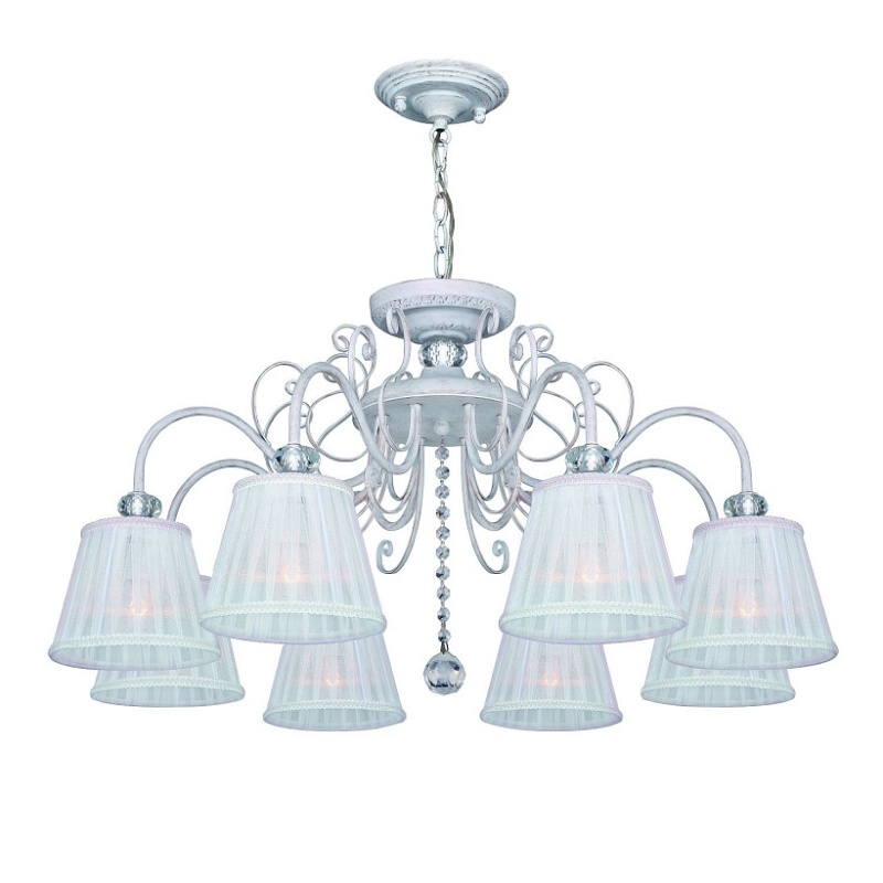 Металлический каркас состаренного белого цвета с золотом, абажуры из белой органзы, декор из прозрачного хрусталя, регулируемая высота.