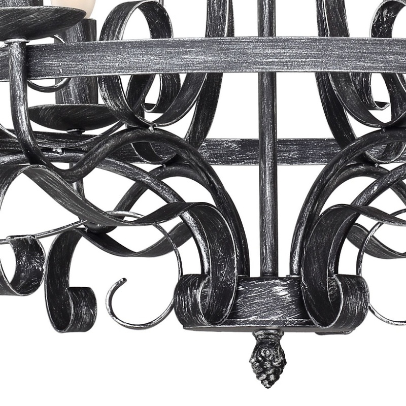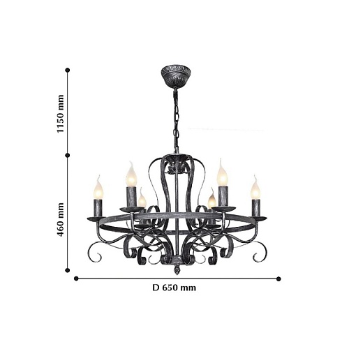 Металлический каркас состаренного черного цвета с серебром, сменные лампы в виде пламени свечи, декоративные кованные элементы.