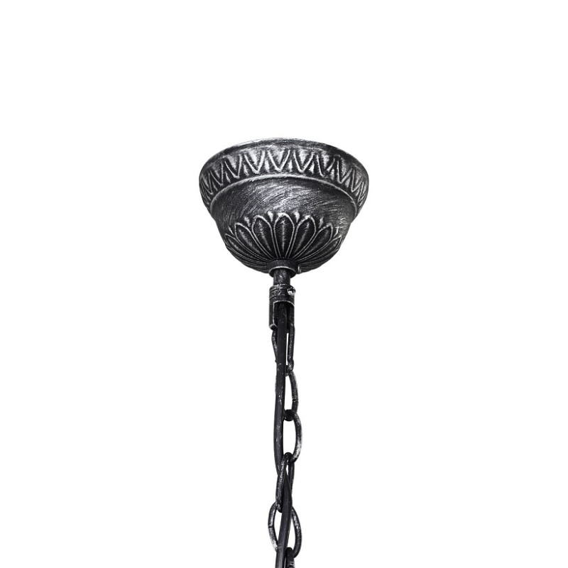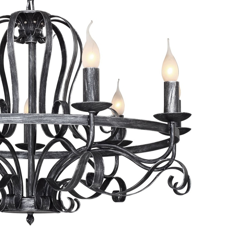 Металлический каркас состаренного черного цвета с серебром, сменные лампы в виде пламени свечи, декоративные кованные элементы.