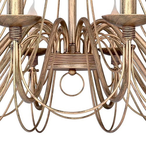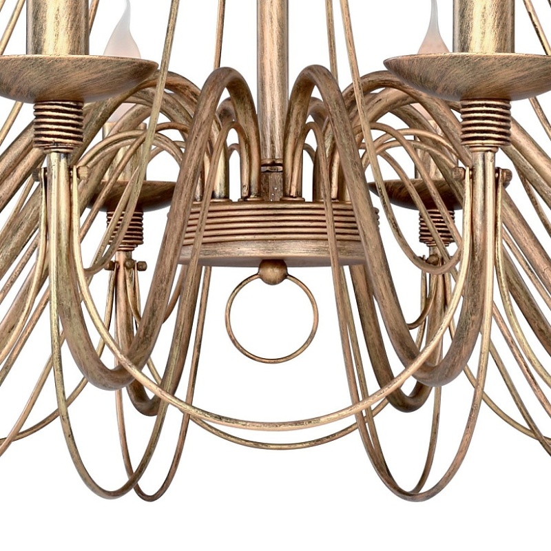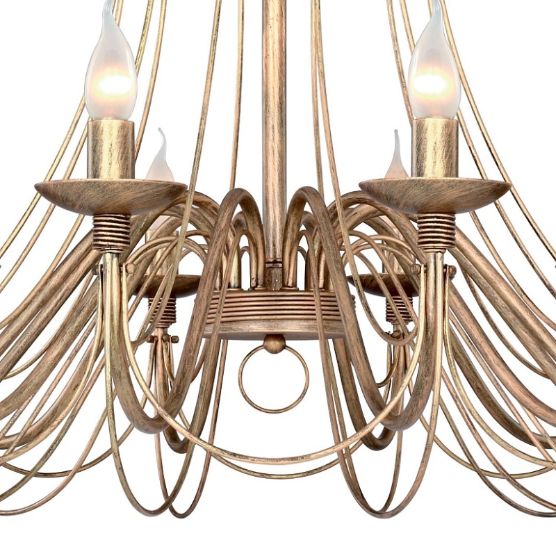 Металлический каркас состаренного коричневого цвета с золотом, сменные лампы в виде пламени свечи, регулируемая высота.