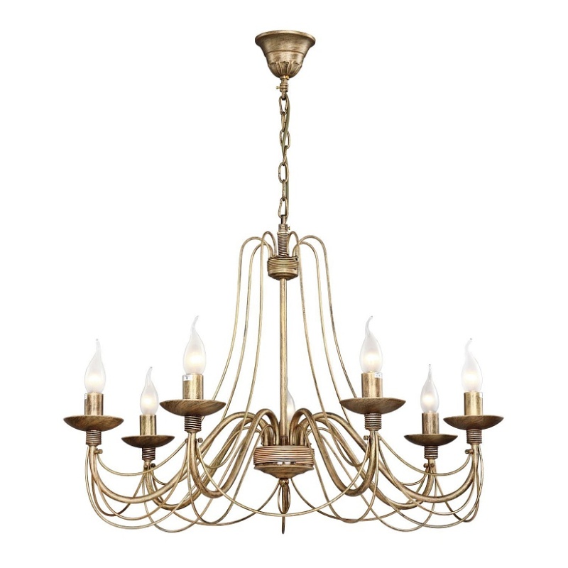 Металлический каркас состаренного коричневого цвета с золотом, сменные лампы в виде пламени свечи, регулируемая высота.
