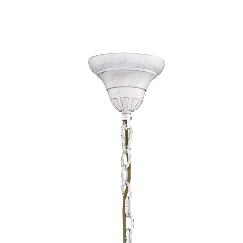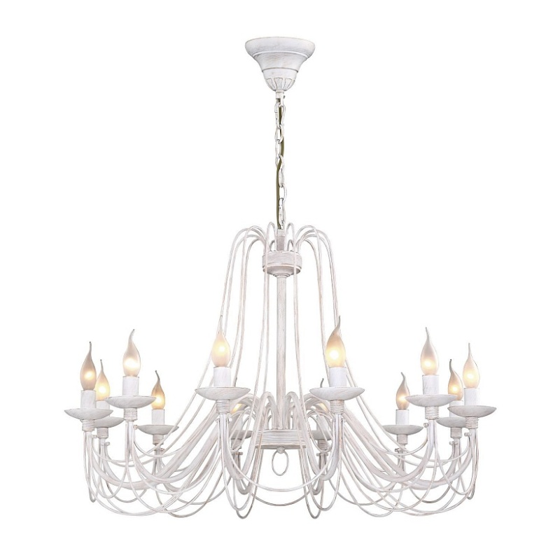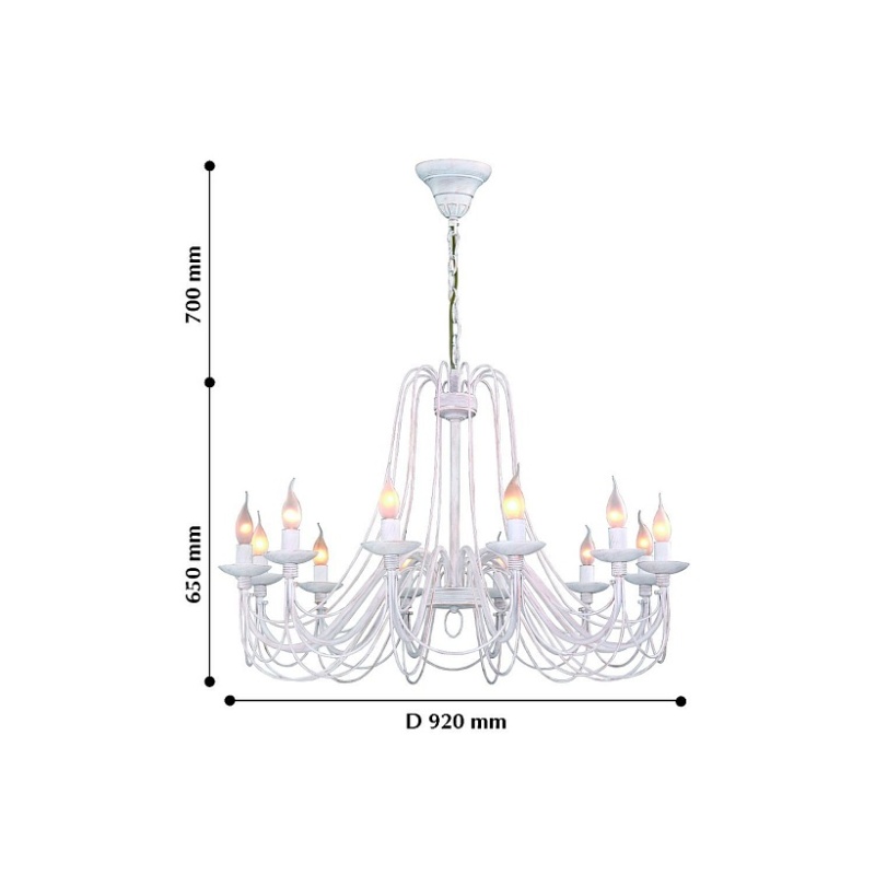 Металлический каркас состаренного белого цвета с золотом, сменные лампы в виде пламени свечи, регулируемая высота.