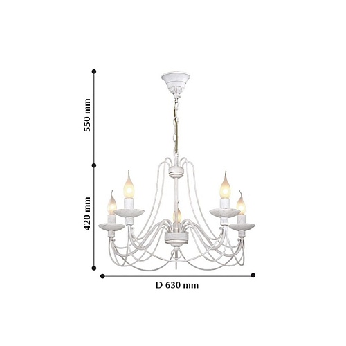 Металлический каркас состаренного белого цвета с золотом, сменные лампы в виде пламени свечи, регулируемая высота.