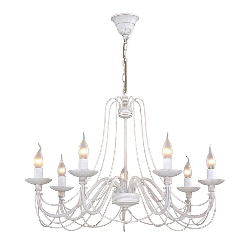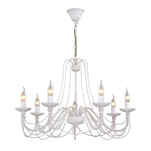 Металлический каркас состаренного белого цвета с золотом, сменные лампы в виде пламени свечи, регулируемая высота.