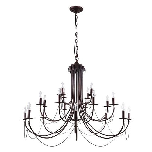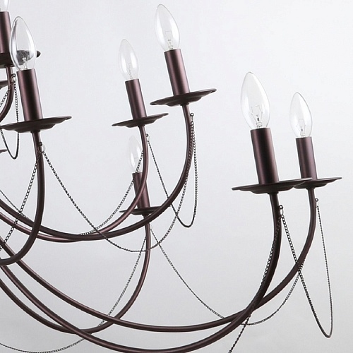 Металлический каркас кофейного цвета, декор из тонких цепей, регулируемая высота, сменные лампы.