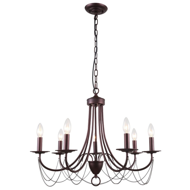 Металлический каркас кофейного цвета, декор из тонких цепей, регулируемая высота, сменные лампы.