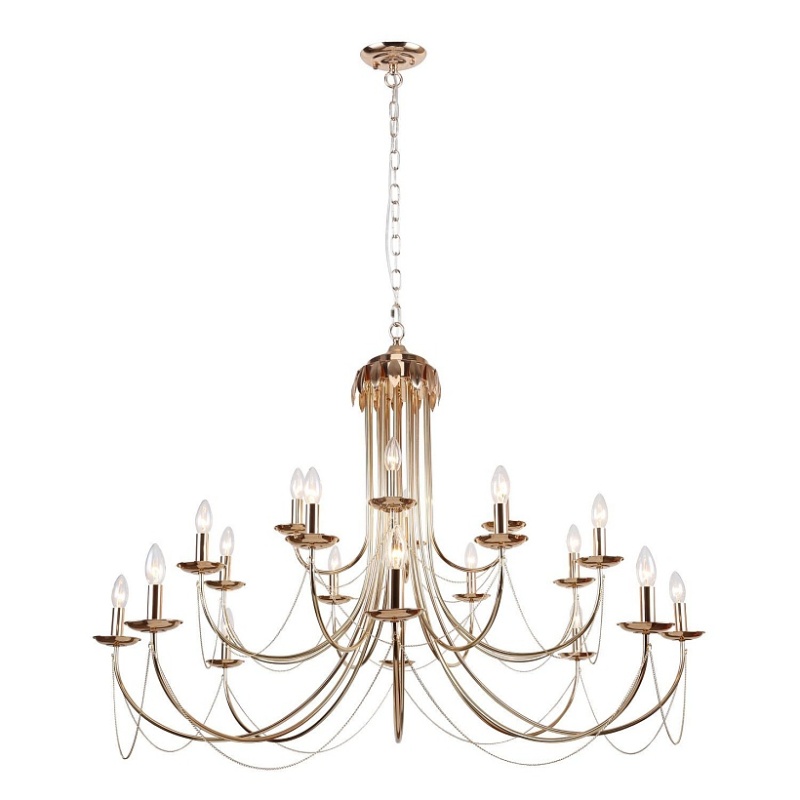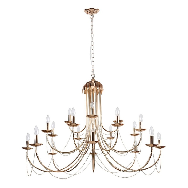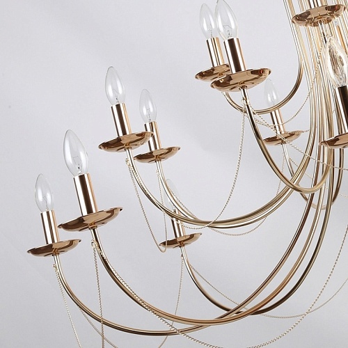 Металлический каркас золотого цвета, декор из тонких цепей, регулируемая высота, сменные лампы.