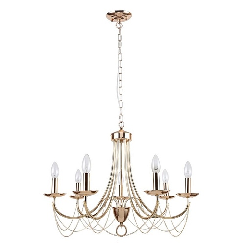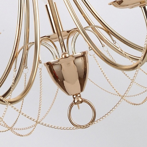 Металлический каркас золотого цвета, декор из тонких цепей, регулируемая высота, сменные лампы.