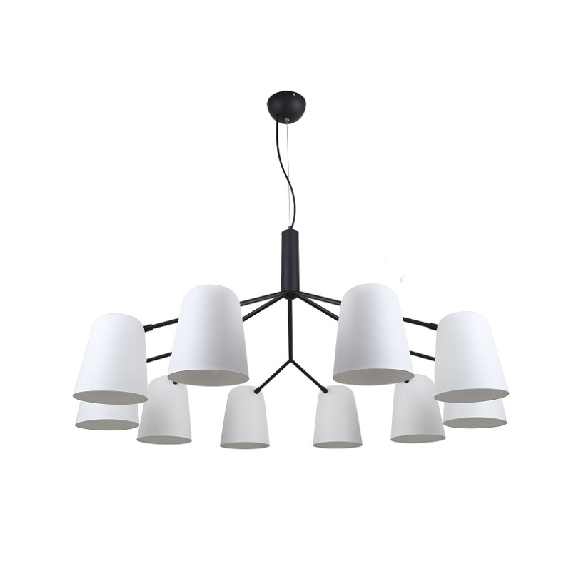 Металлический каркас черного цвета, металлические плафоны белого цвета, регулируемая высота.