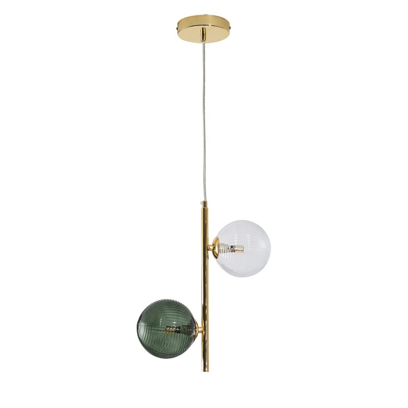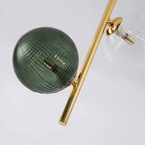Металлический каркас цвета светлого золота, стеклянные плафоны прозрачного и зеленого цвета, сменная лампа, регулируемая высота.