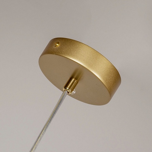 каркас изогнутой формы цвета золота, плафоны из выдувного стекла белого цвета, часть каркаса фиксируется тросиком для баланса