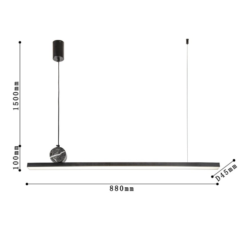 Металлический каркас матового черного цвета, рассеиватель из белого акрила, круглый декоративный элемент цвета черного мрамора, часть Металлический каркаса фиксируется тросиком для баланса, регулируемая высота.