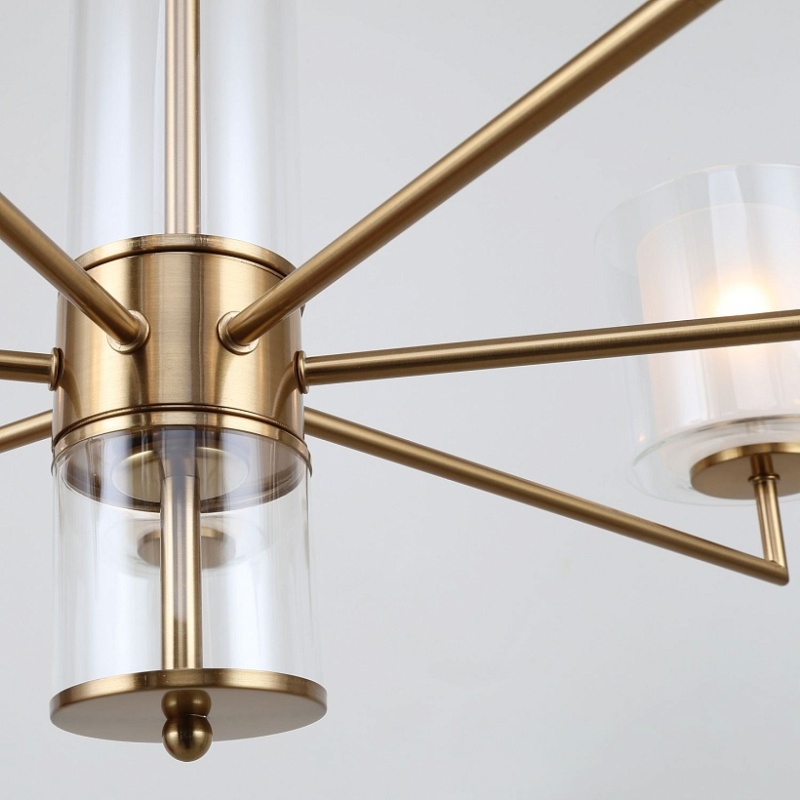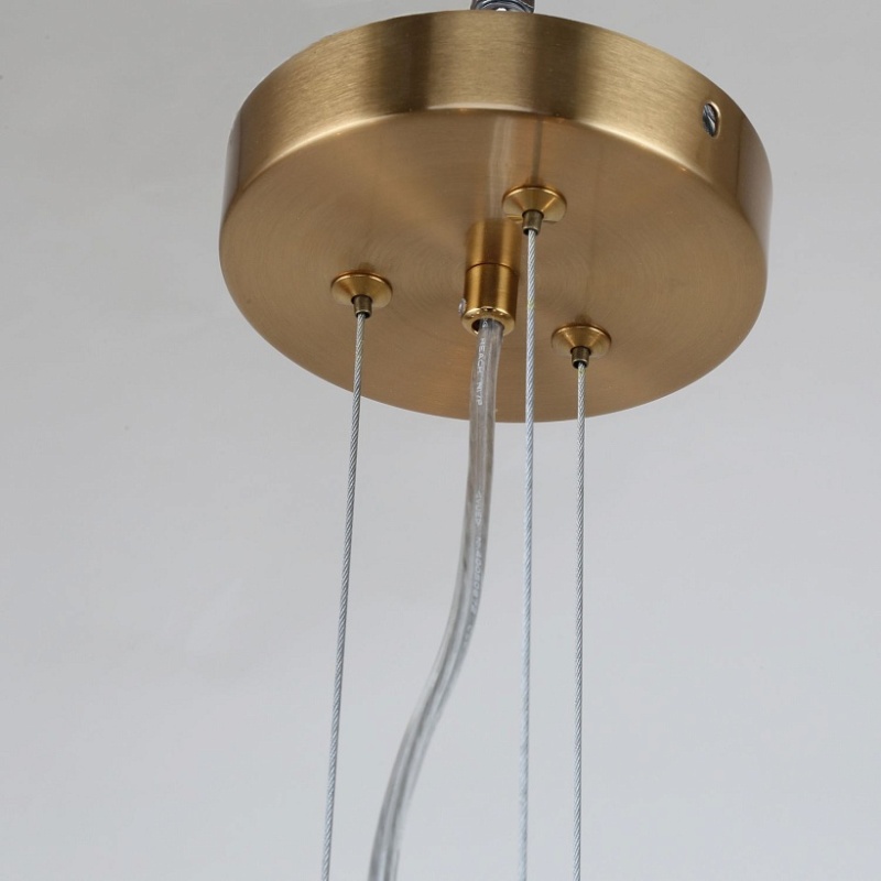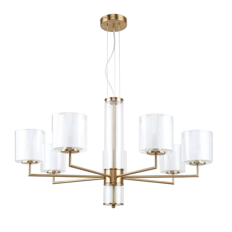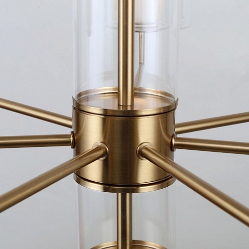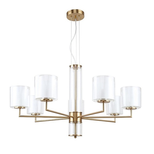 Металлический каркас латунного цвета, двуслойные плафоны из прозрачного и белого стекла, стеклянный декор на центральном штоке, регулируемая высота.