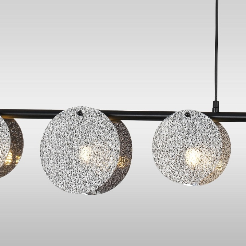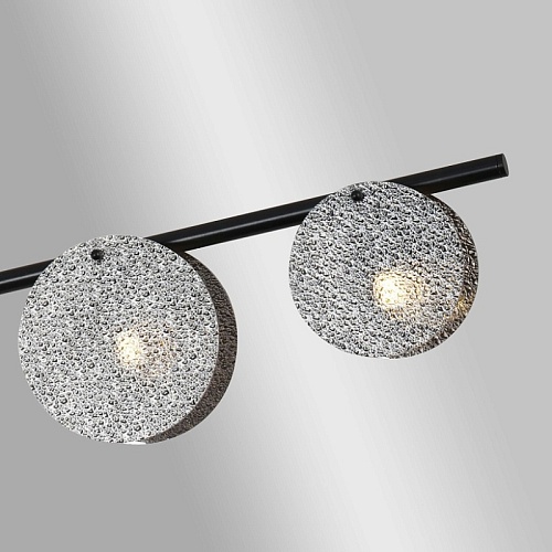 Каркас черного цвета, круглые декоративные элементы из стекла кракле дымчато-серого цвета с зеркальным покрытием.