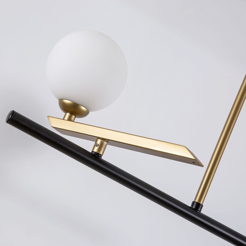 каркас матового черного цвета с золотыми декоративными элементами, поворотные плафоны из выдувного стекла белого цвета, часть каркаса фиксируется трос