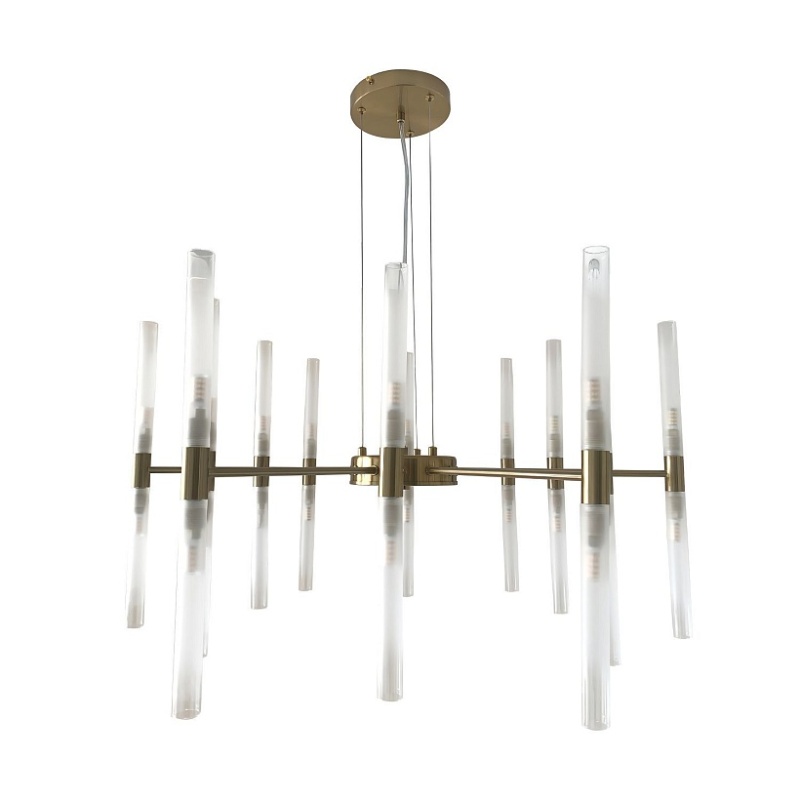 Металлический каркас цвета латунь, сочетание коротких латунных трубок и стеклянных плафонов с матовыми белыми и прозрачными фрагментами, сменная лампа.