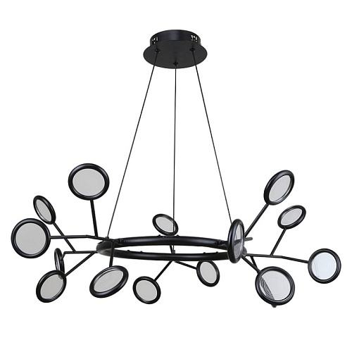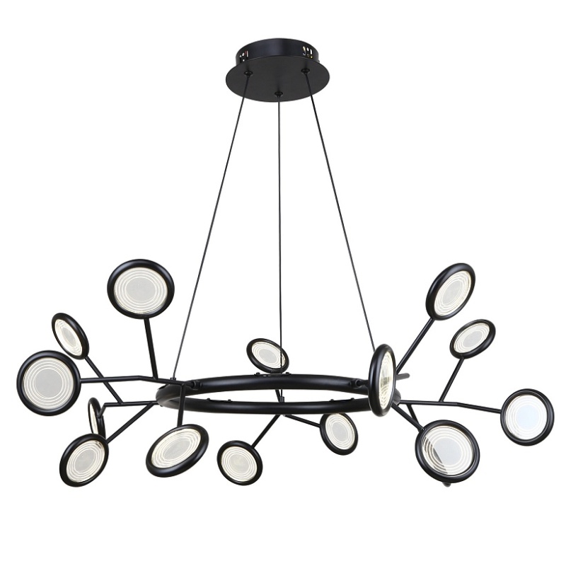 Металлический каркас матового черного цвета, внутренний периметр плафонов подсвечен лентой-LED, рассеиватель из акрила с нанесенным на него круговым узором, регулируемая высота.