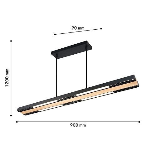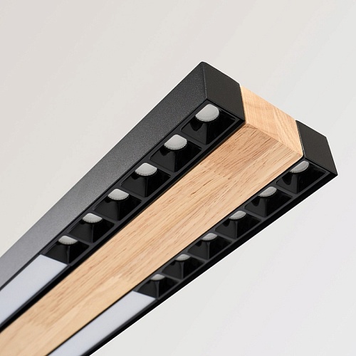 Металлический каркас черного матового цвета, декоративная вставка из МДФ с фактурой дерева на основании светильника, LED-модуль с рассеивателем из белого непрозрачного пластика и отдельные световые элементы.