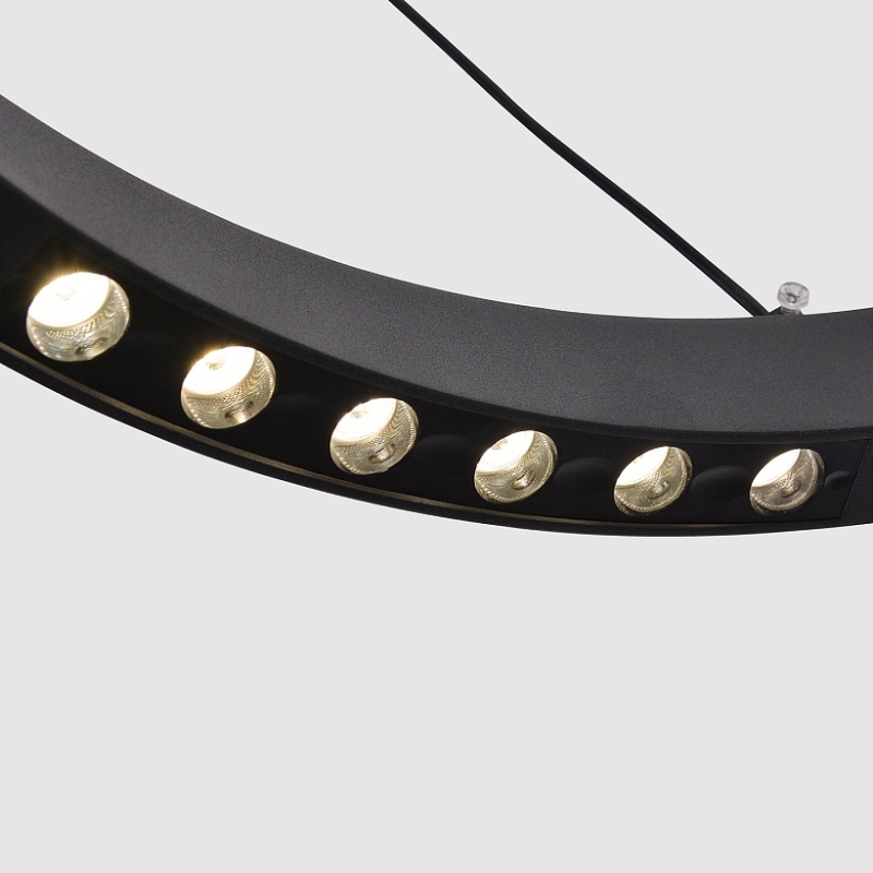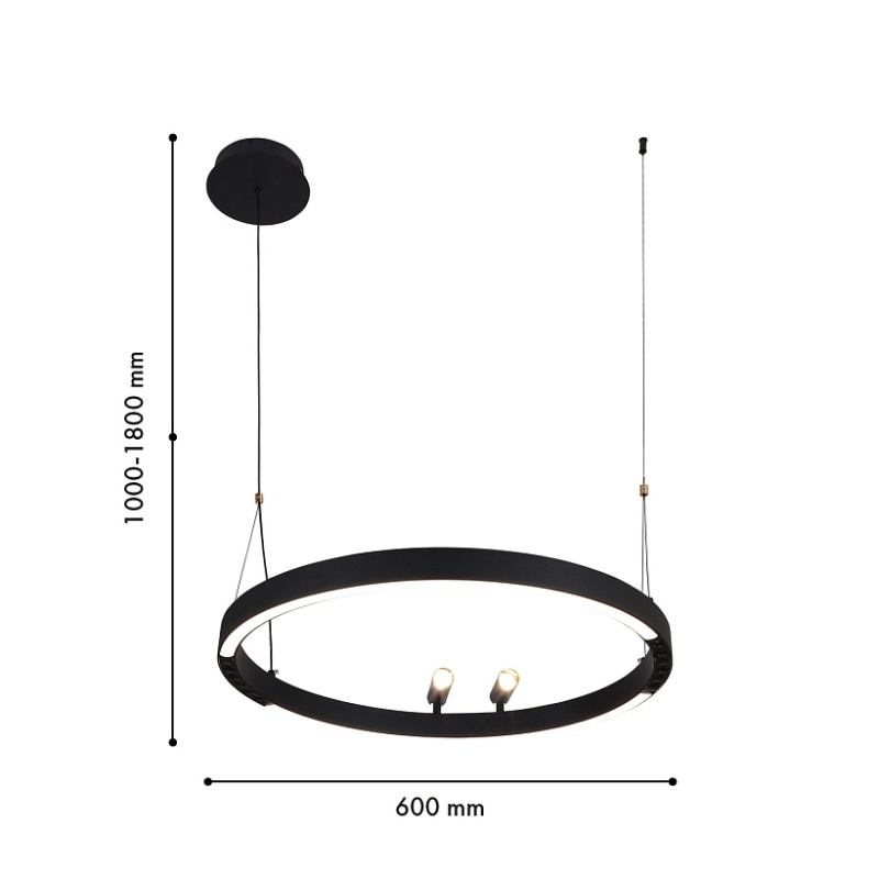 Металлический каркас черного цвета, на декоративном кольце размещены несколько технических источников света, включая поворотные споты, встроенную линию с лентой LED и модули с гнездовыми светодиодами, пульт управления регулирует мощность и температуру света, регулируемая высота.