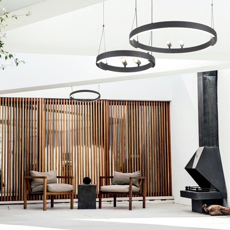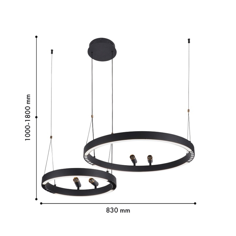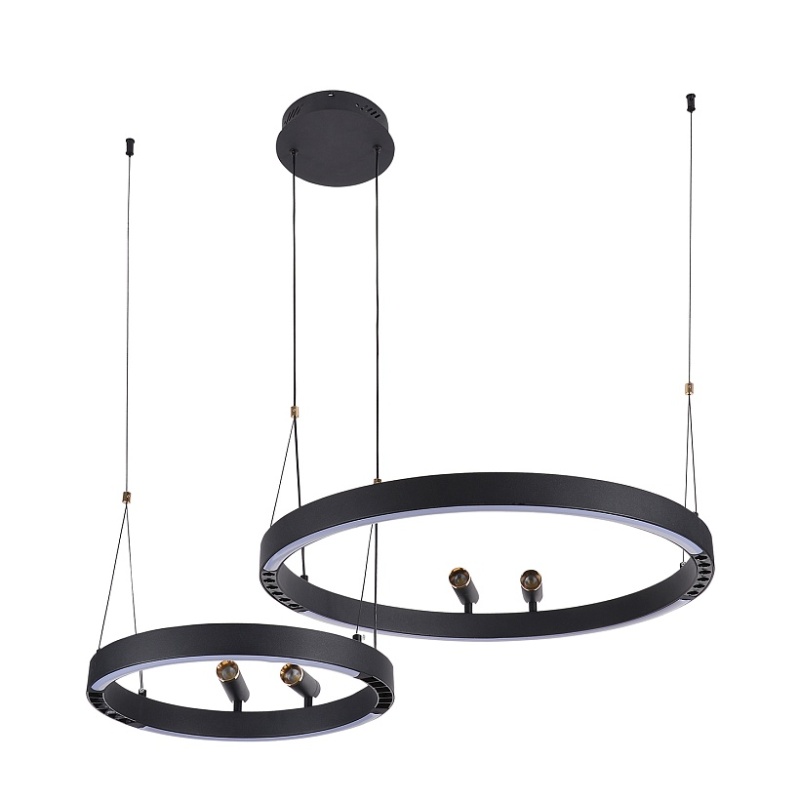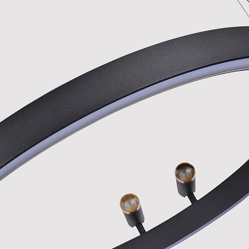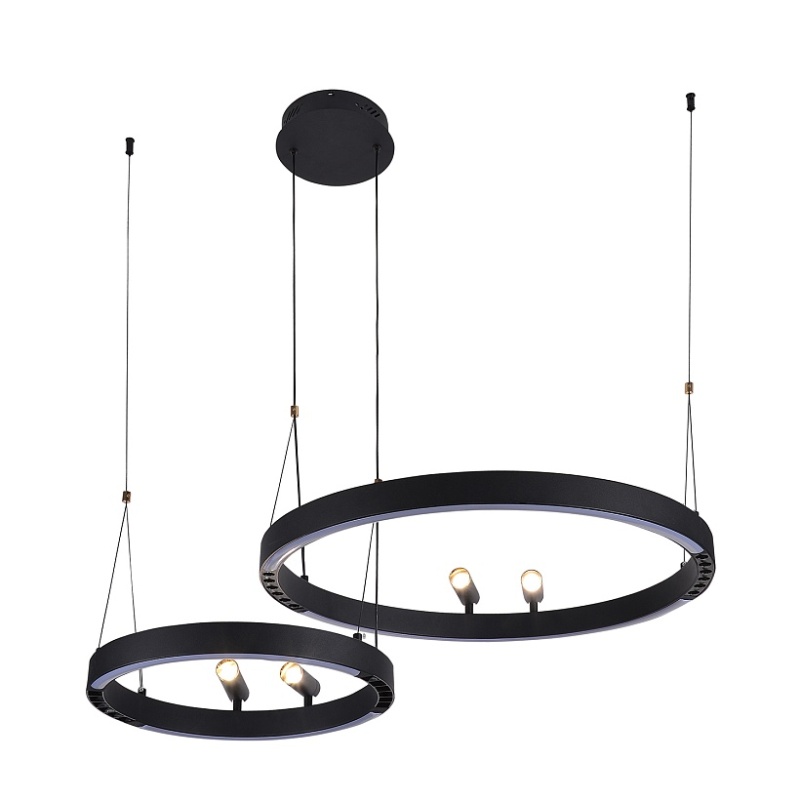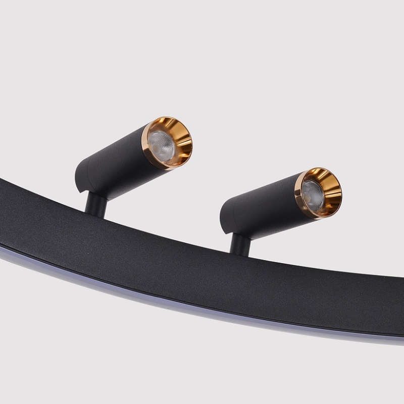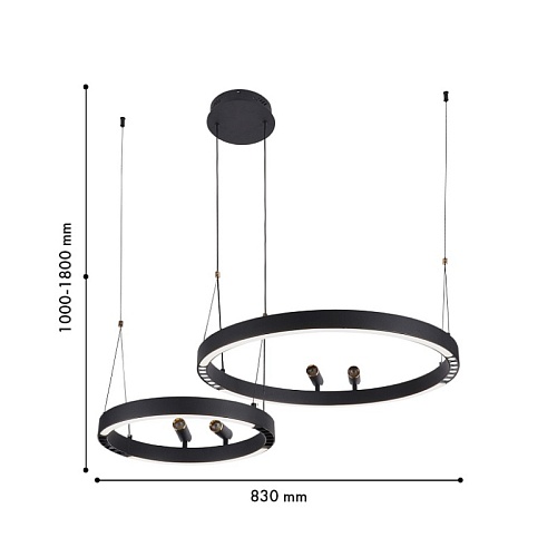 Металлический каркас черного цвета, состоящий из двух колец, на декоративных кольцах размещены несколько технических источников света, включая поворотные споты, встроенную линию с лентой LED и модули с гнездовыми светодиодами, пульт управления регулирует мощность и температуру света, регулируемая высота.