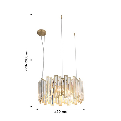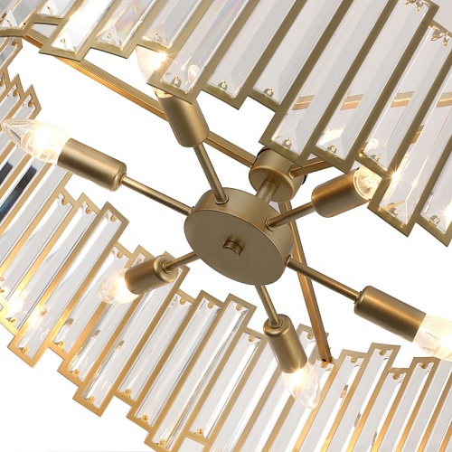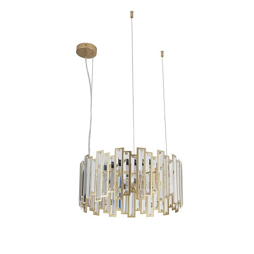 Металлический каркас золотого цвета с кольцом диаметром 45 см из скрепленных друг с другом металлических рамок разного размера, в которые инкрустированы удлиненные пластины из прозрачного хрусталя, цоколь E14, регулируемая высота.