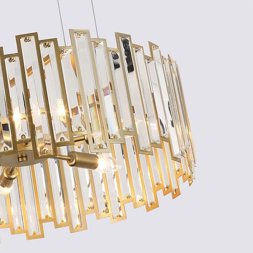 Металлический каркас золотого цвета с кольцом из скрепленных друг с другом металлических рамок разного размера, в которые инкрустированы удлиненные пластины из прозрачного хрусталя, цоколь E14, регулируемая высота.