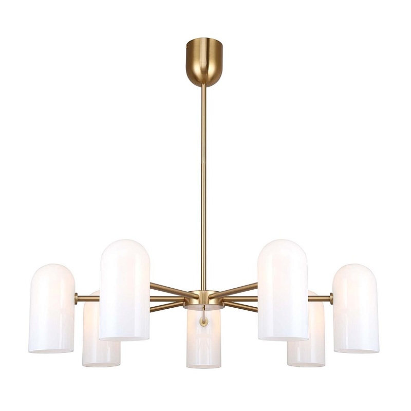 Каркас из металла цвета латунь, плафоны из белого стекла, регулируемая высота, сменная лампа G9.