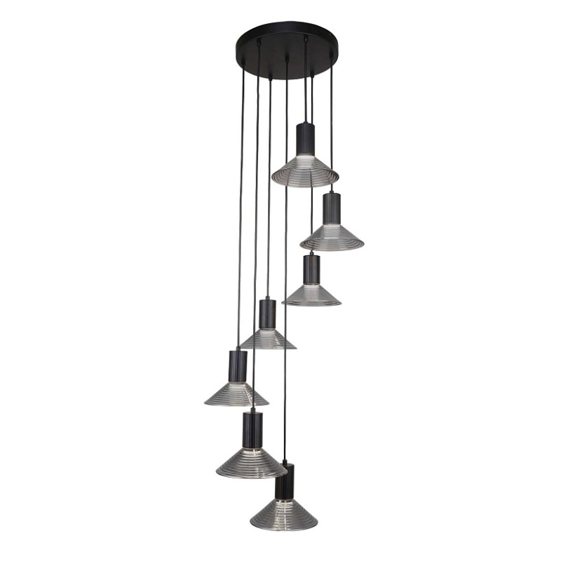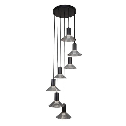 Каркас из металла черного матового цвета, плафоны из рифленого стекла, регулируемая высота, LED-модуль.