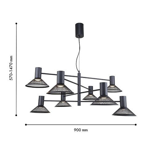 Каркас из металла черного матового цвета, плафоны из металлической сетки, регулируемая высота, LED-модуль.