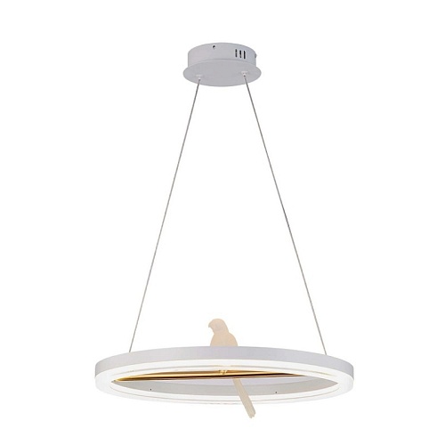 Каркас из металла белого цвета, декоративный элемент в виде попугайчика, рассеиватель из акрила, регулируемая высота, LED-модуль.