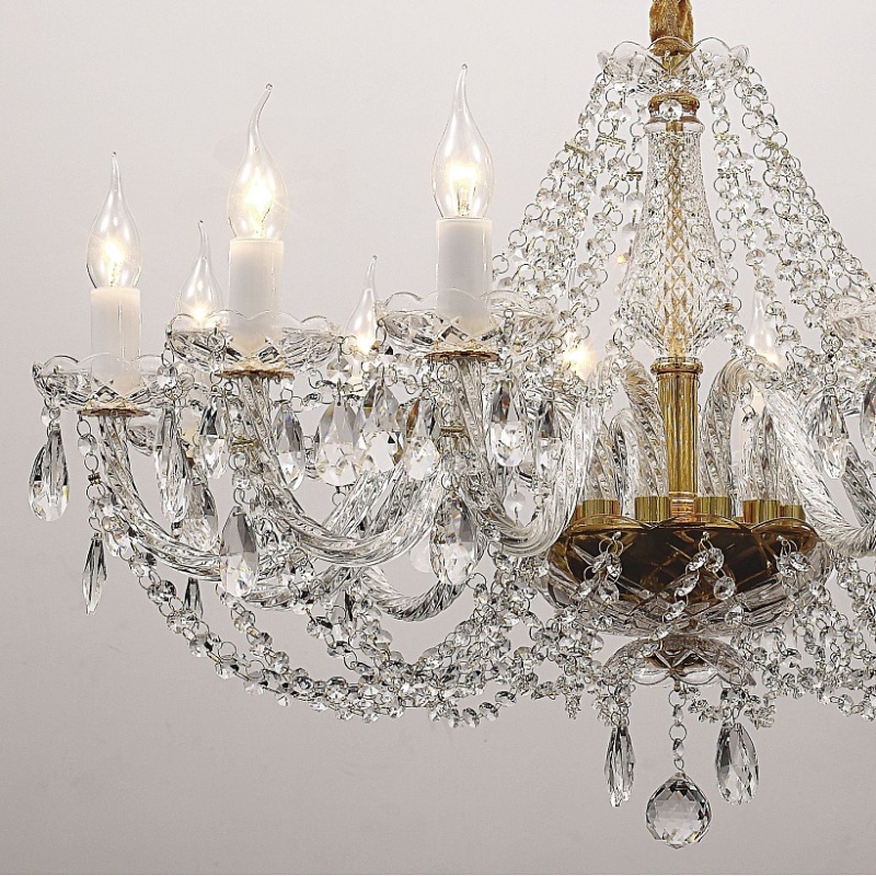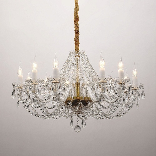 Металлический каркас золотого цвета, хрусталь высшего качества и стеклянные рожки и блюдца прозрачного цвета.