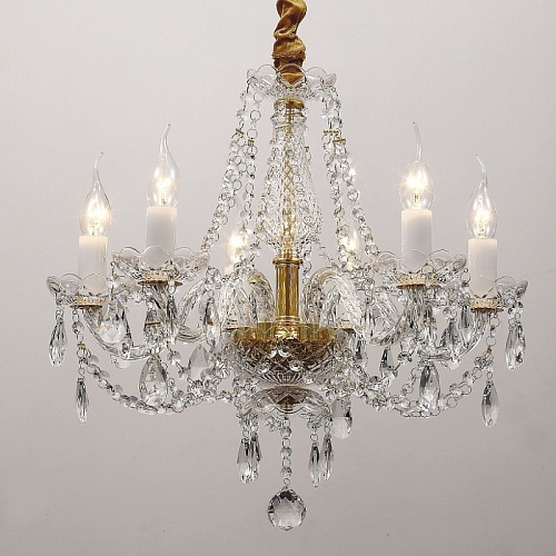 Металлический каркас золотого цвета, хрусталь высшего качества и стеклянные рожки и блюдца прозрачного цвета.