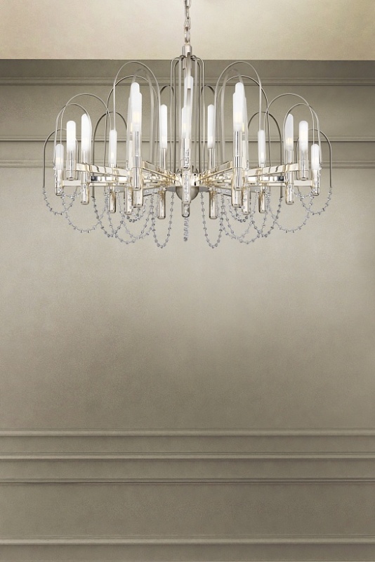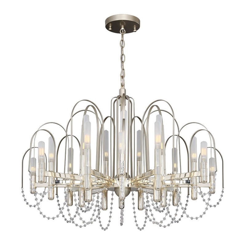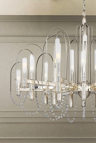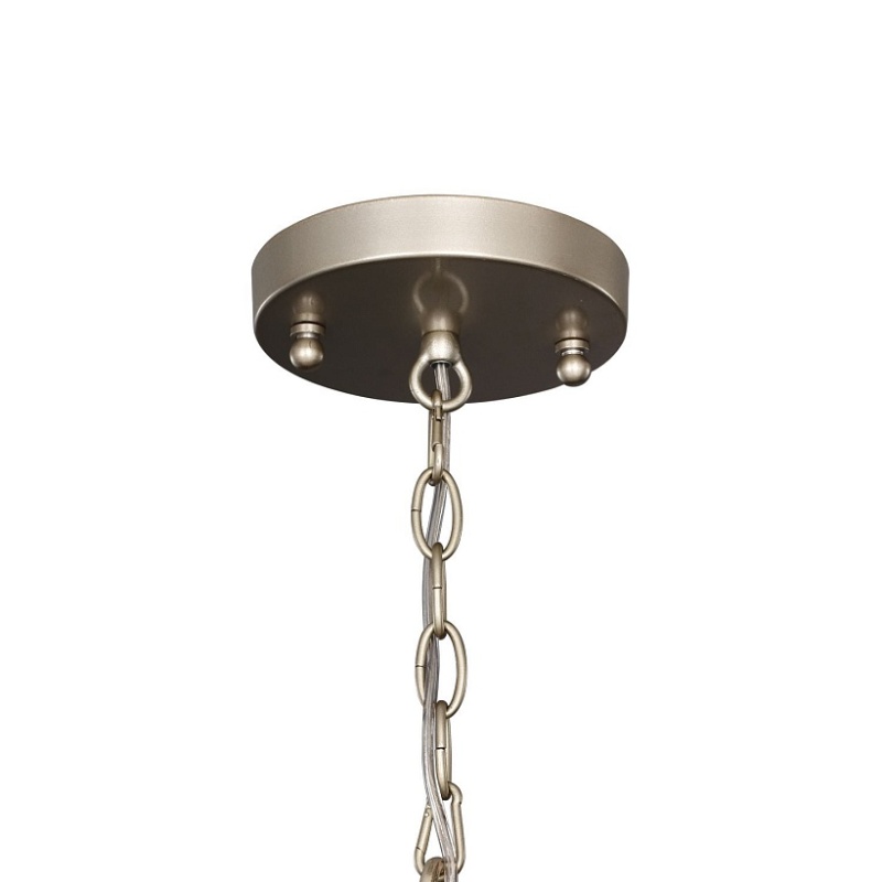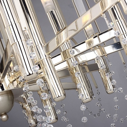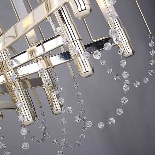 Каркас цвета золотистого шампанского, декор из цепочек с хрустальными шариками, лампы G9 закрывают плафоны из матового стекла.