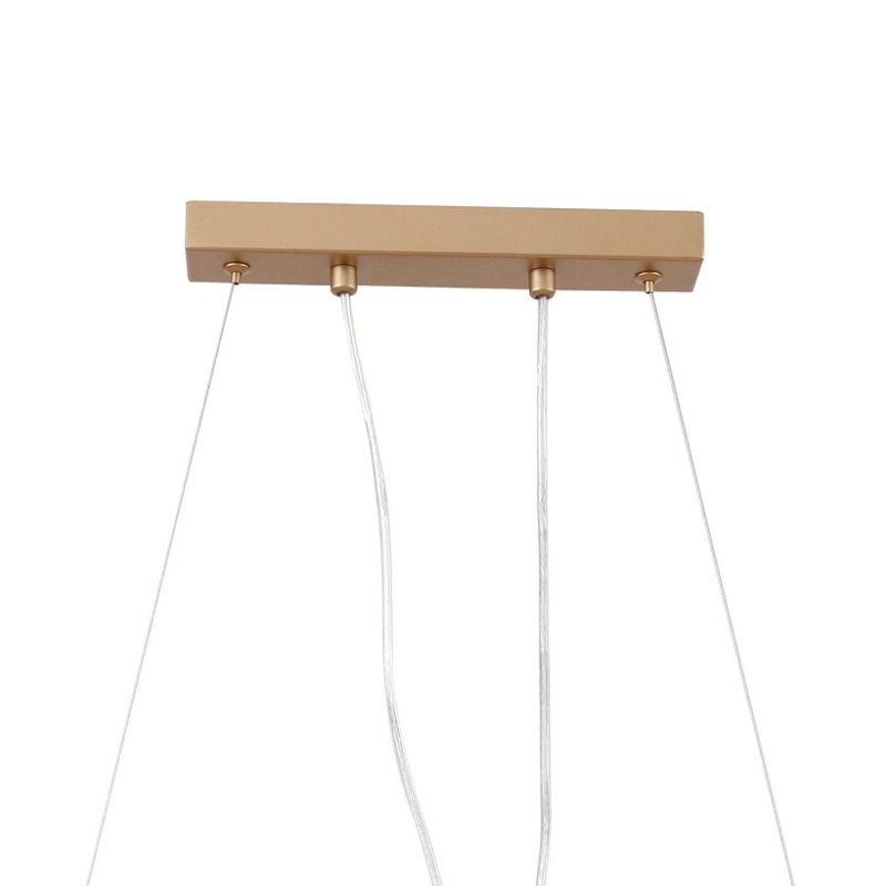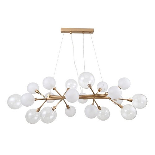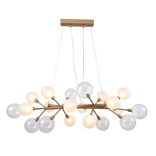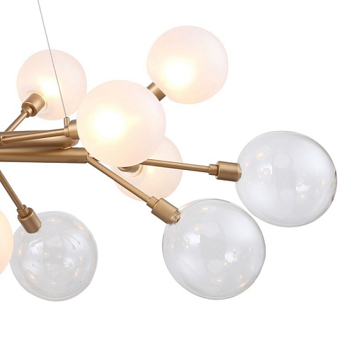 Металлический каркас золотого цвета, плафоны разного размера из белого и прозрачного стекла, регулируемая высота.