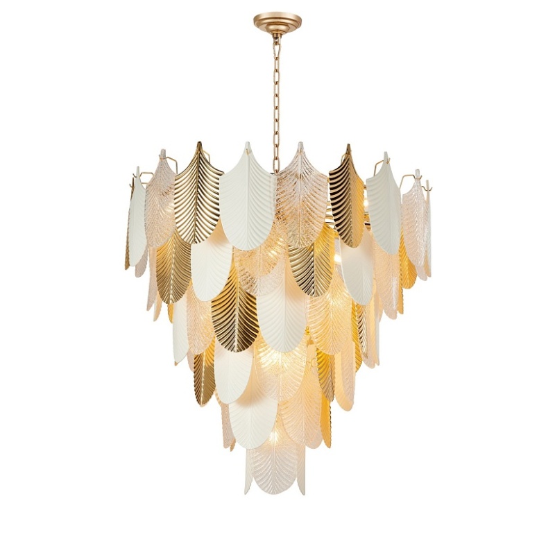 Каркас золотого цвета, декоративные элементы из белого фарфора, полупрозрачного стекла и золотого металла