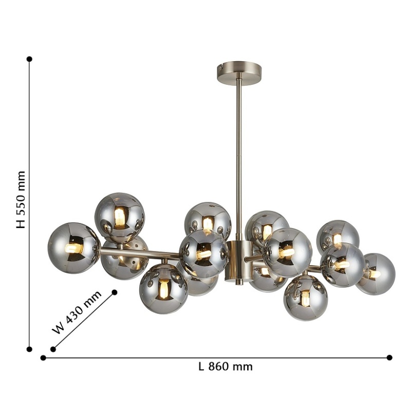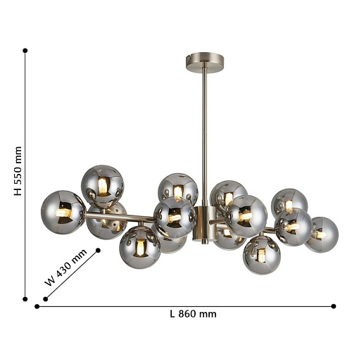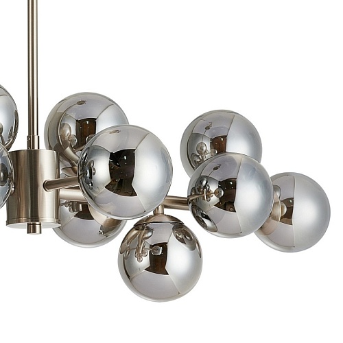 Металлический каркас цвета никель, плафоны из выдувного стекла дымчато-серого цвета.