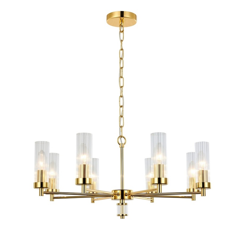 Металлический каркас золотого цвета, плафон из прозрачного рифленого стекла, регулируемая высота.