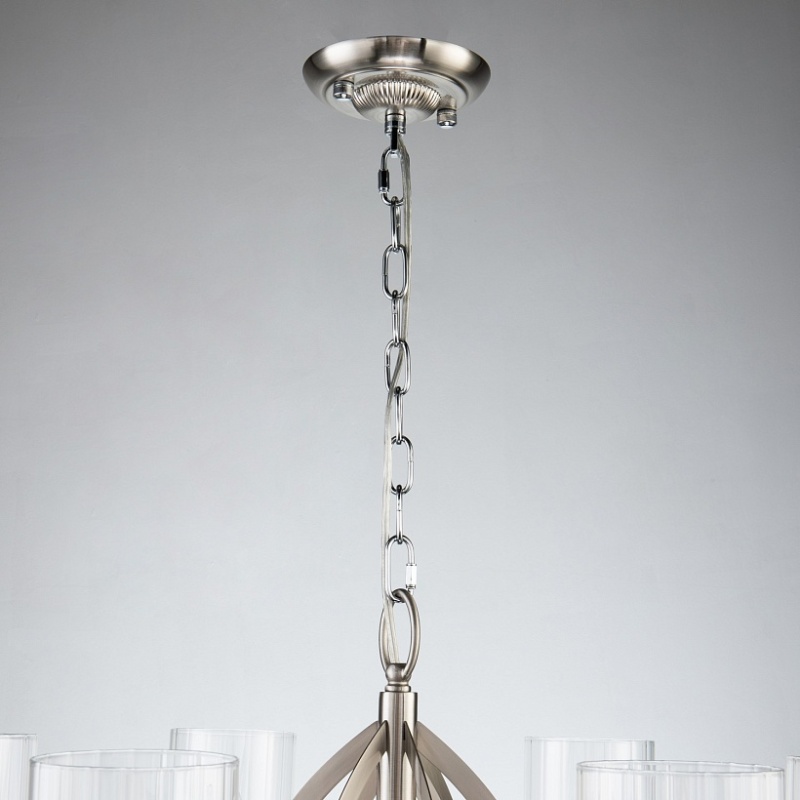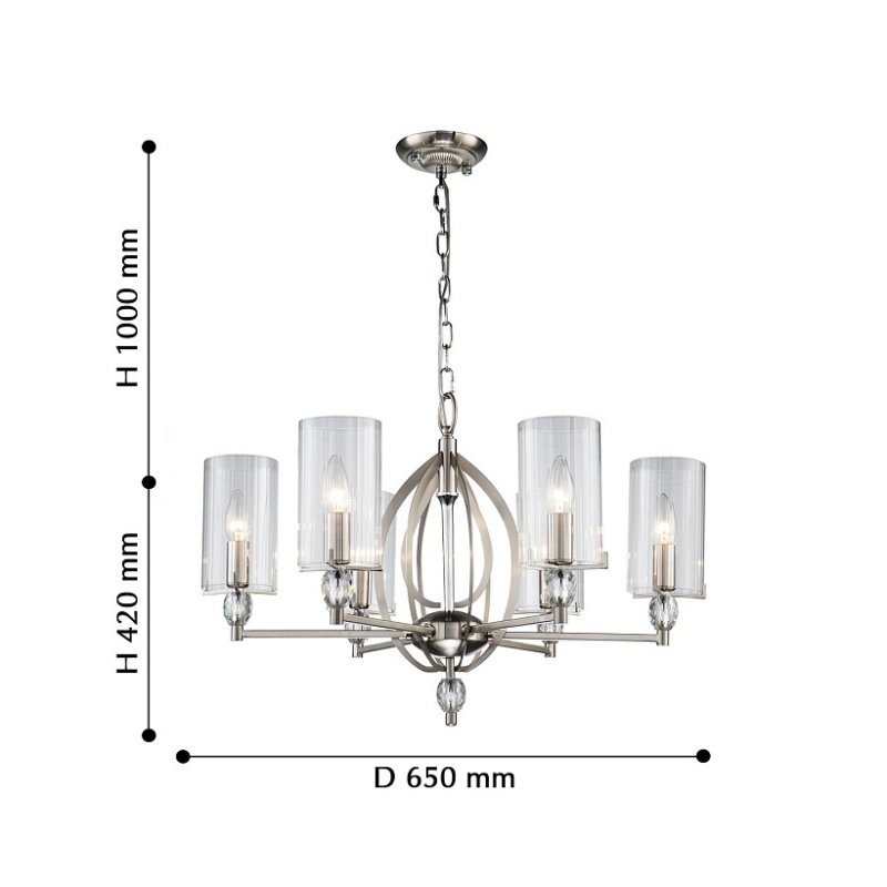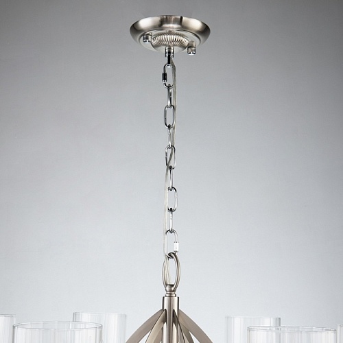 Каркас цвета никель, плафоны из прозрачного узорного стекла, декоративные элементы из прозрачного хрусталя.