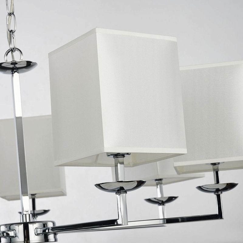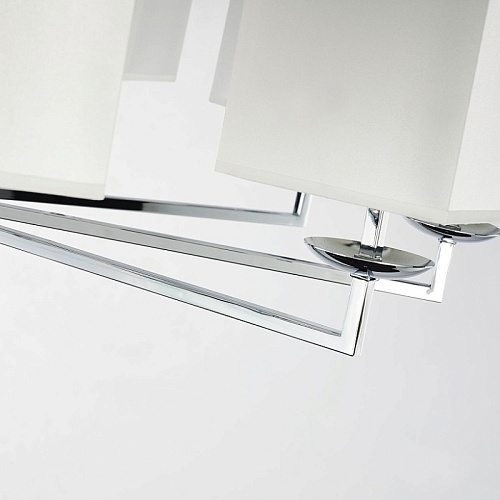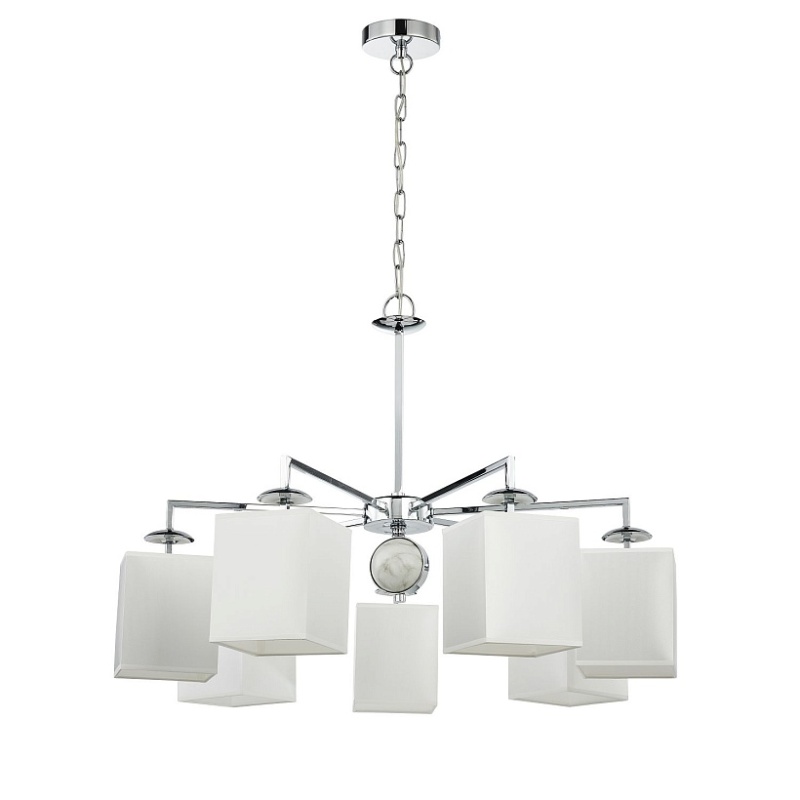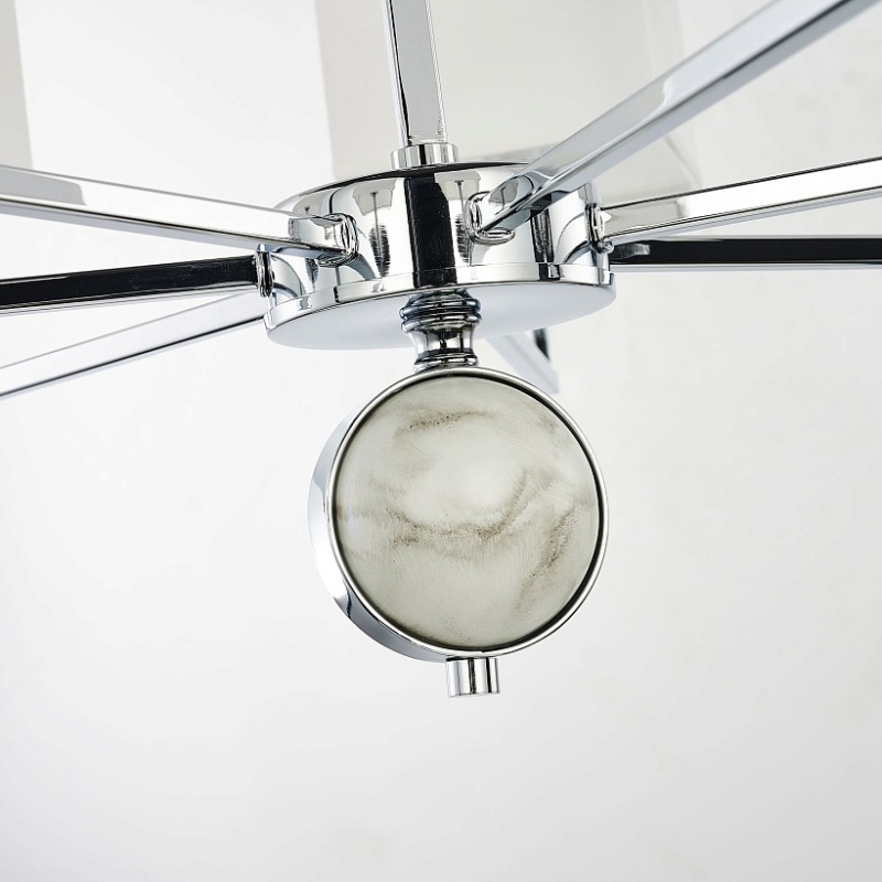 Хромированный, металлический каркас, плафоны из белой ткани, декор - имитация белого мрамора, каркас можно монтировать как вверх, так и вниз плафонами.