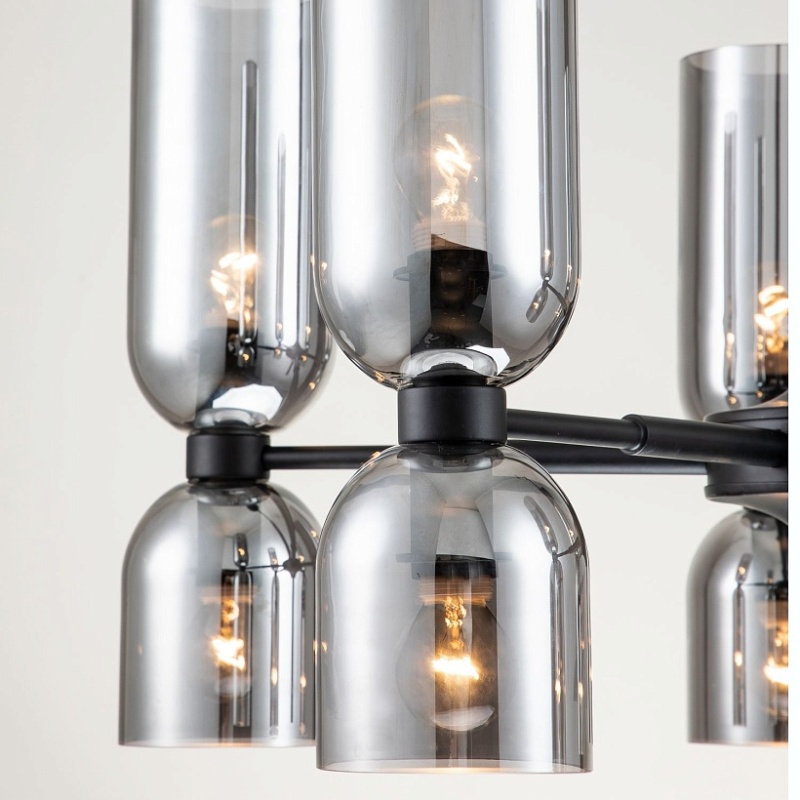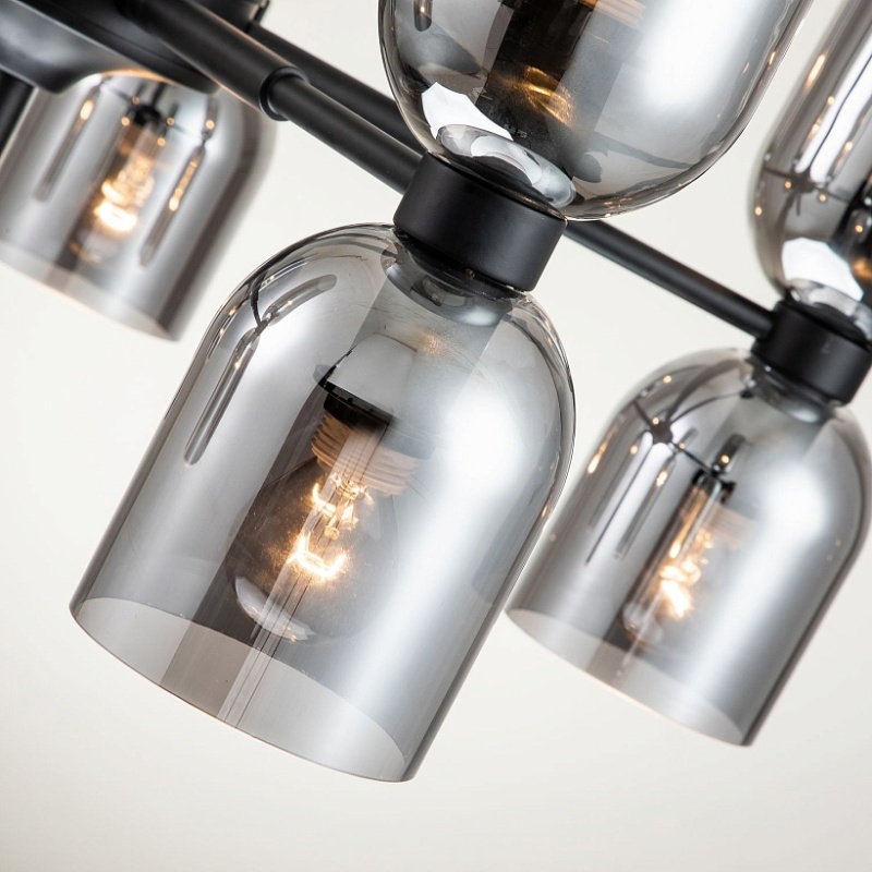 Металлический каркас черного цвета, плафоны из стекла дымчато-серого цвета.