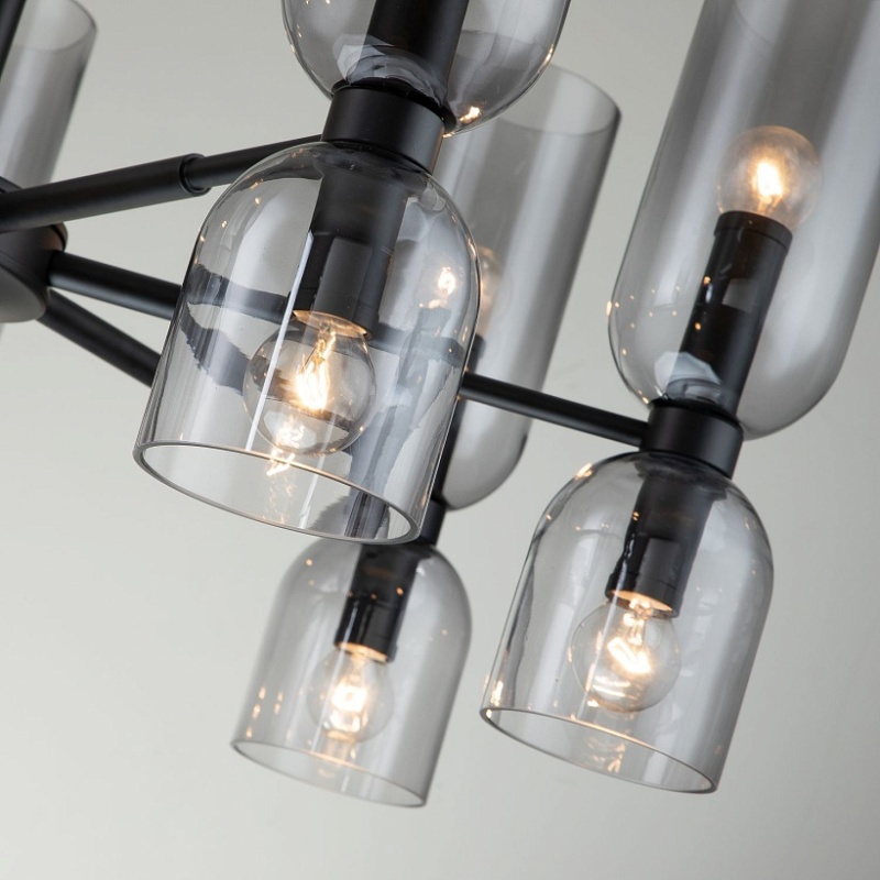Металлический каркас черного цвета, плафоны из стекла дымчато-серого цвета.