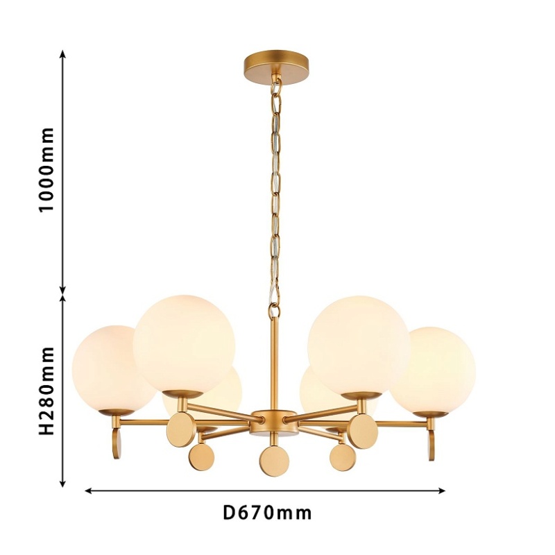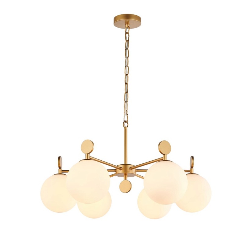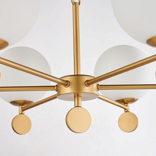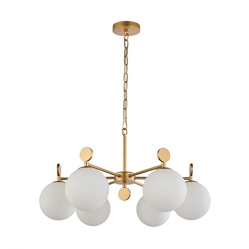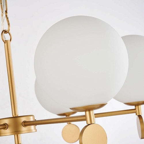 Каркас золотого цвета, плафоны из стекла цвета опала, люстру можно монтировать плафонами вверх или вниз, сменные лампы, цоколь Е14.