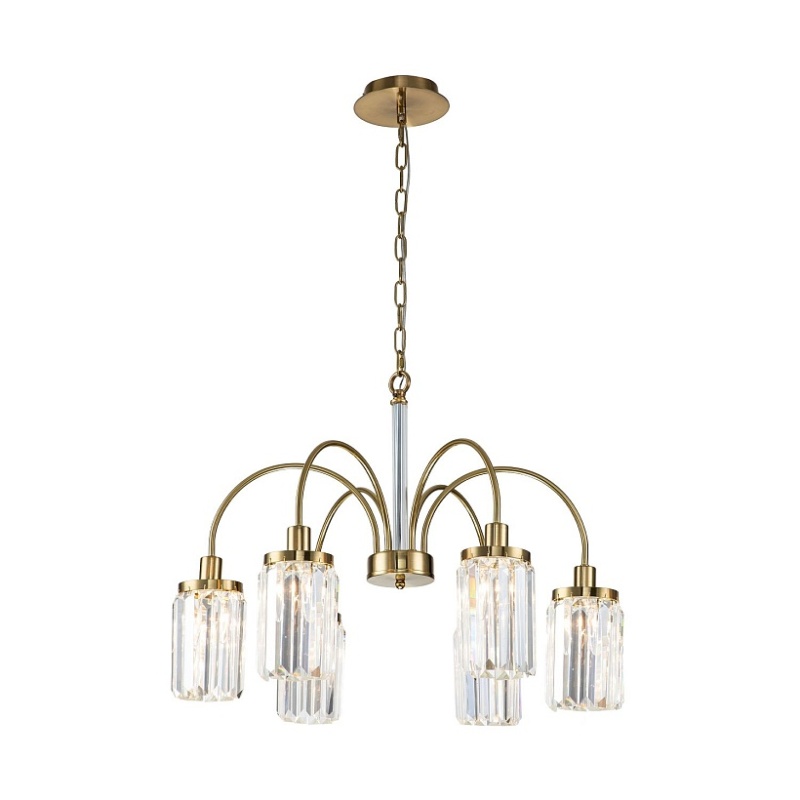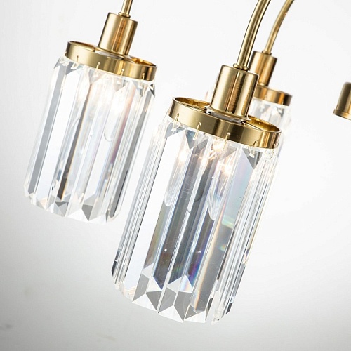 Металлический каркас золотого цвета, плафоны из прозрачных хрустальных элементов.