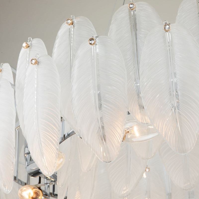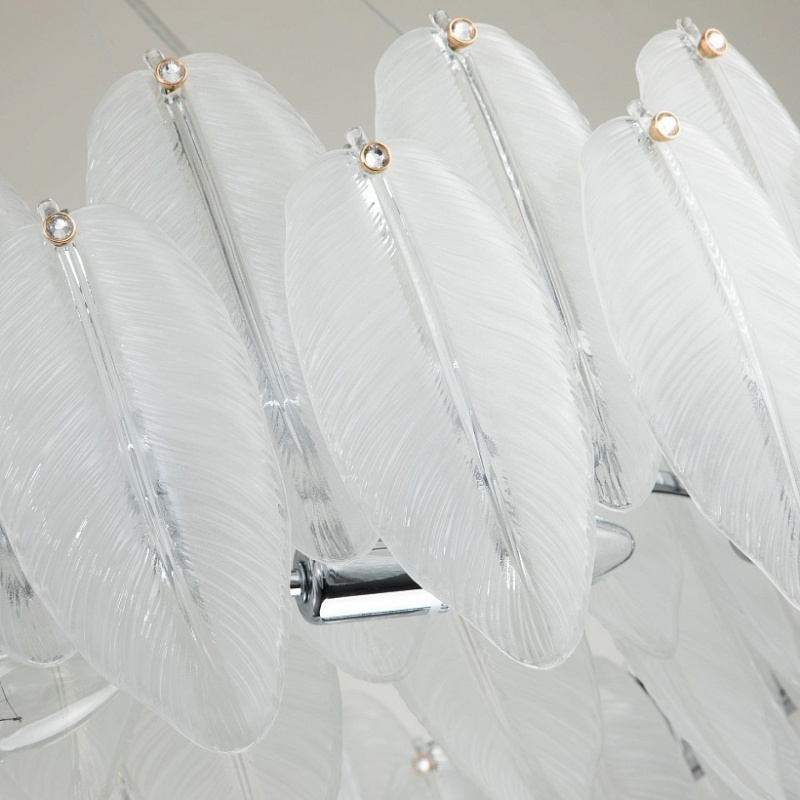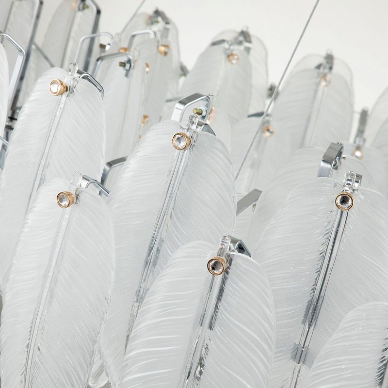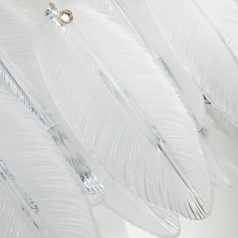 Каркас цвета хром, лепестки из полупрозрачного стекла, декор в виде кристалла в золотом обрамлении на каждом лепестке.