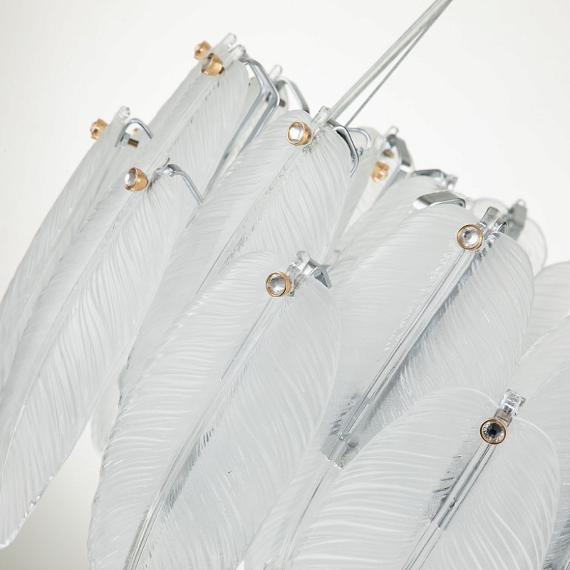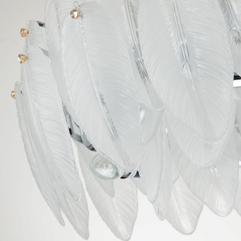 Каркас цвета хром, лепестки из полупрозрачного стекла, декор в виде кристалла в золотом обрамлении на каждом лепестке.