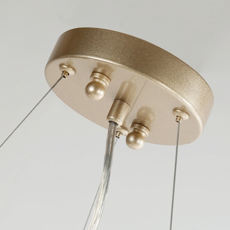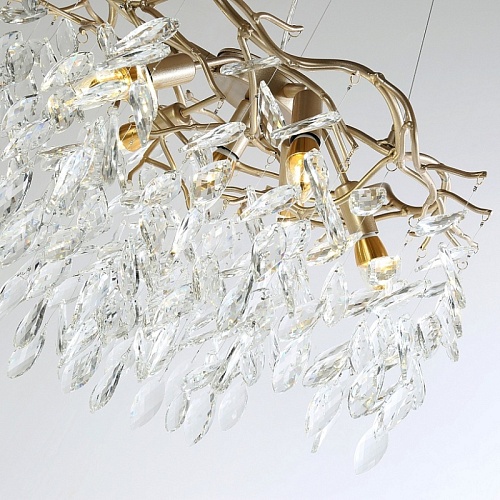 Металлический каркас цвета матового золота, напоминающий сплетенные ветви дерева, плафон декорирован хрустальными подвесками в виде листочков.