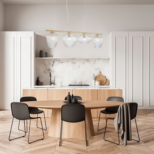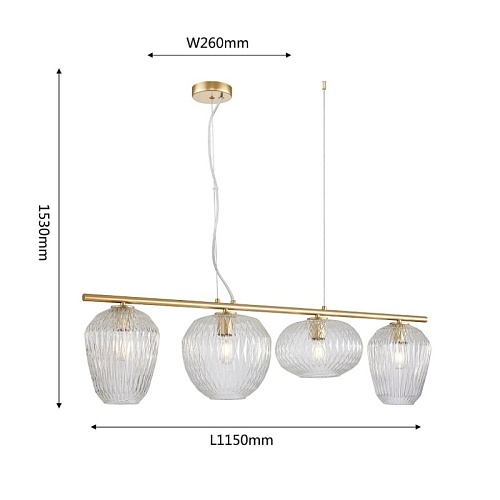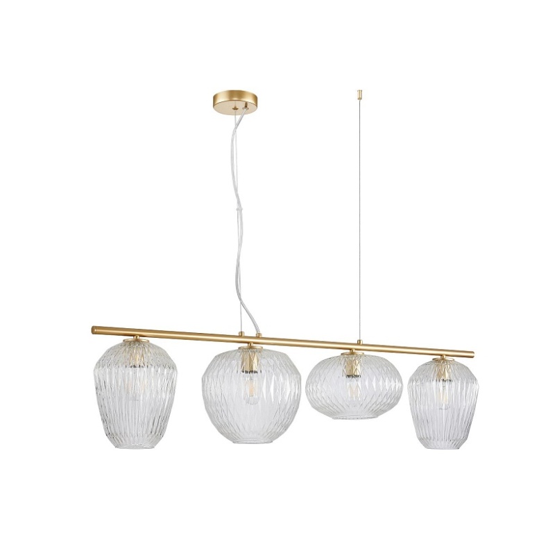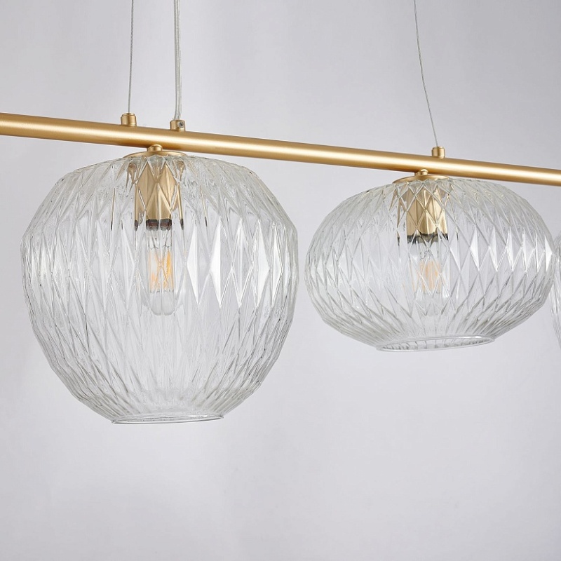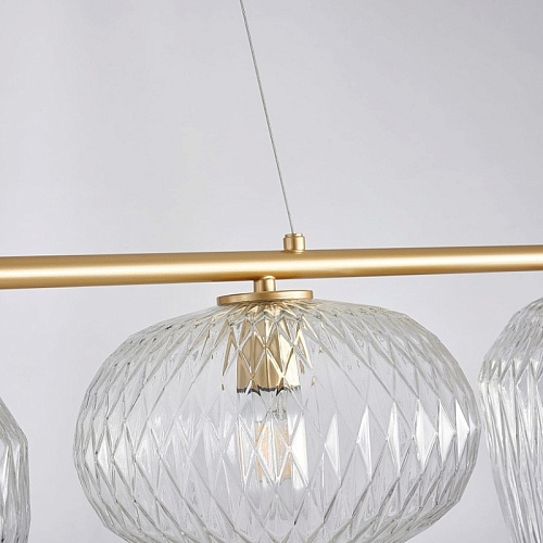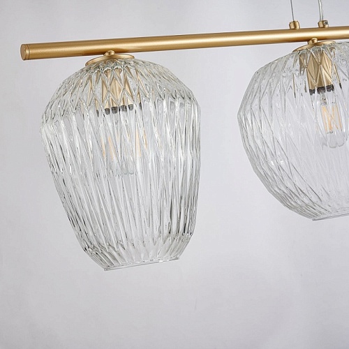 каркас цвета матового золота, плафоны разнообразных форм из выдувного узорного прозрачного стекла, часть каркаса фиксируется тросиком для баланса