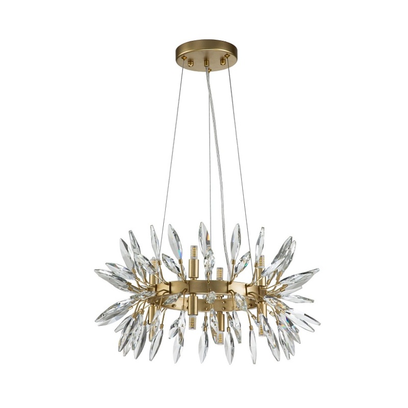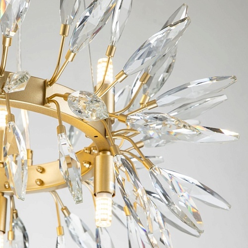 каркас цвета золота, источники света направлены вверх и вниз, декоративные элементы из прозрачного хрусталя миндалевидной формы, лампу G9 можно менять