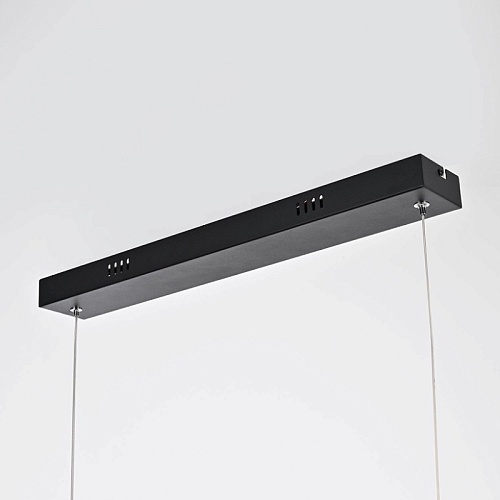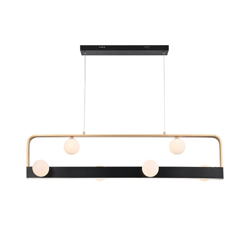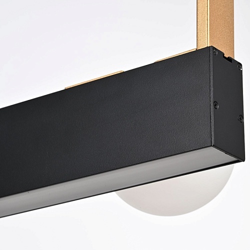 Каркас черного цвета в сочетании с золотым, плафоны из белого акрила, два источника света - встроенная лента LED и лампы внутри плафонов.